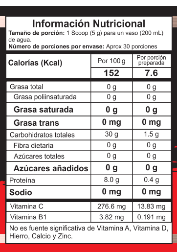 Creatina Monohidrato, mezcla en polvo a base de Uva Micropulverizada para preparar con Ácido Alfa Metil Guanido Acético fortificado con Vitamina C y Vitamina B1.