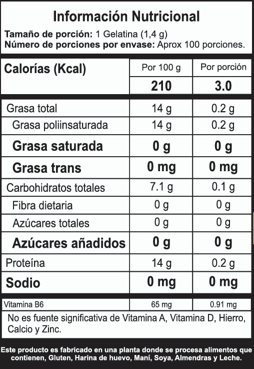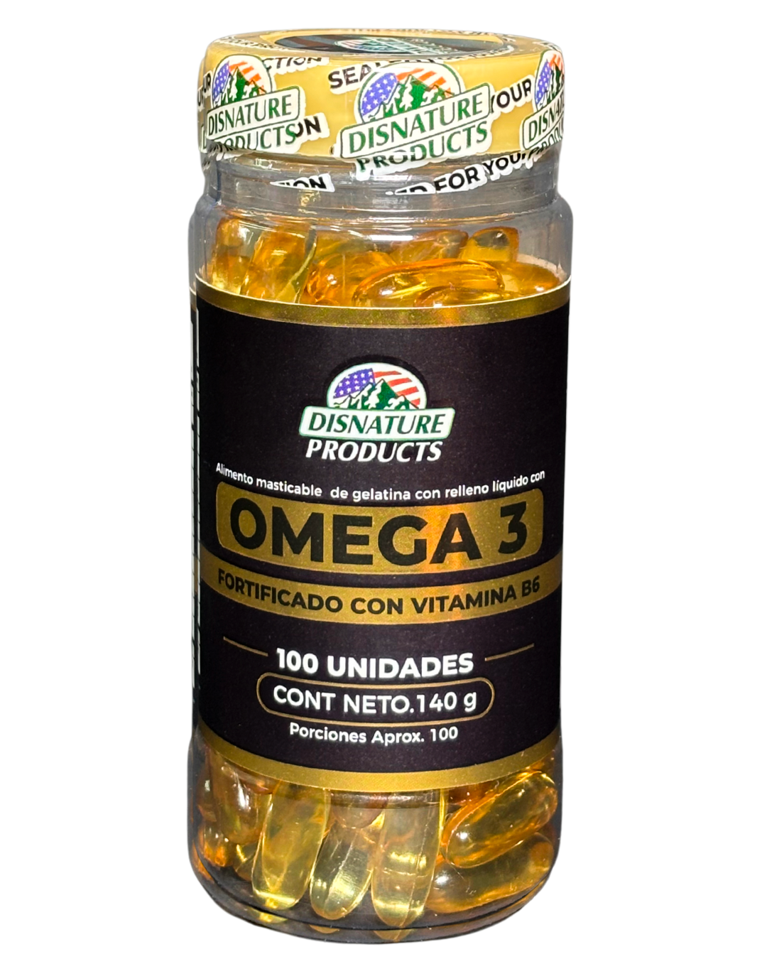 Alimento masticable de gelatina con relleno líquido con Omega 3 fortificado con Vitamina B6.